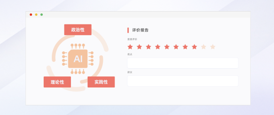 在作業(yè)評估方面,AI助手會(huì)對用戶輸入的作業(yè)內(nèi)容進(jìn)行評價(jià),從政治性、理論性以及實(shí)踐性三大方面進(jìn)行星級評價(jià),并提供優(yōu)點(diǎn)及改進(jìn)建議。