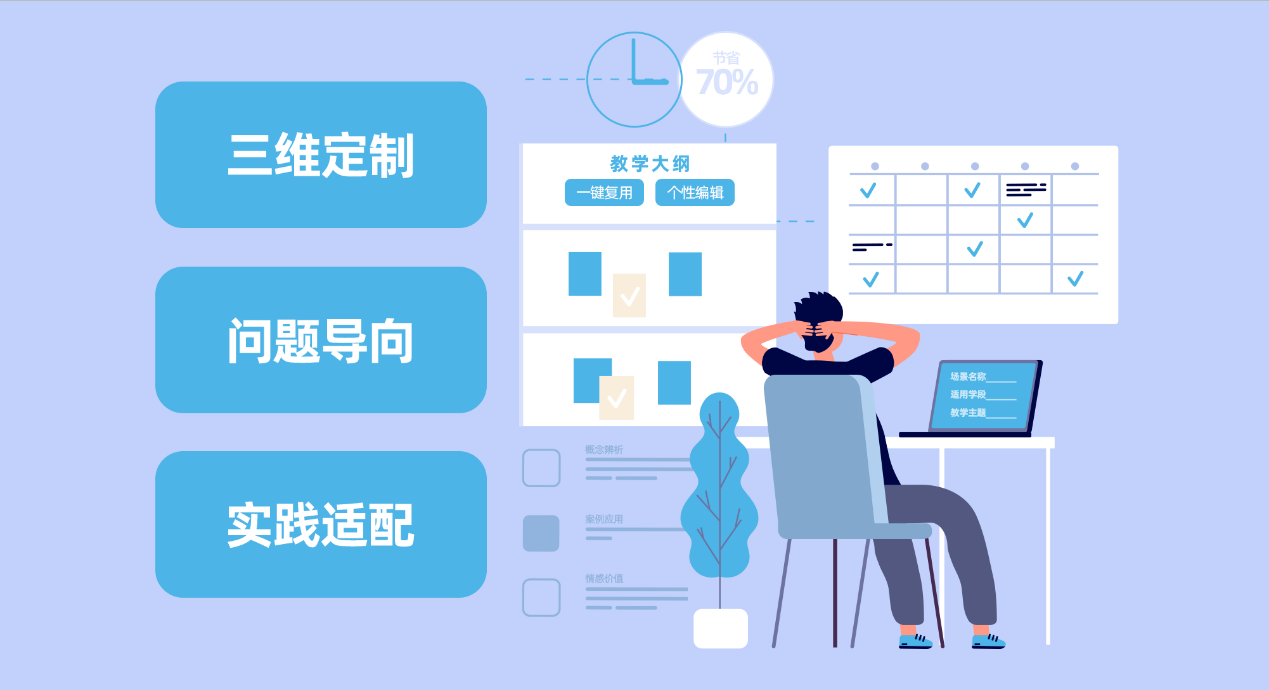針對教師備課耗時長、重難點梳理難等痛點,通過 “三維定制 — 問題導向 — 實踐適配” 功能構建全流程智能支持體系,助力教師從事務性工作中解放,聚焦教學設計創(chuàng)新與深度師生互動。