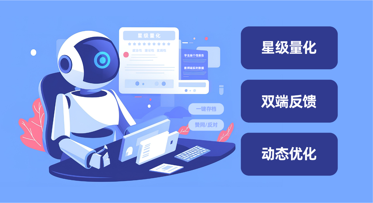 動態(tài)優(yōu)化:評價內(nèi)容可一鍵存檔,師生對評估結果的 “贊同 / 反對” 反饋直接驅(qū)動 AI 系統(tǒng)迭代評估模型,結合真實教學場景數(shù)據(jù)持續(xù)優(yōu)化評價標準,形成 “評估 — 反饋 — 優(yōu)化” 的良性循環(huán)。