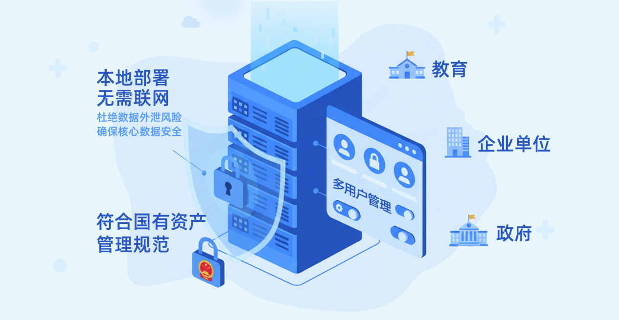 支持本地化部署與離線使用,所有AI運算均在本地完成,無需聯(lián)網(wǎng)即可操作,從根源杜絕數(shù)據(jù)外泄風險;符合國有資產(chǎn)管理規(guī)范與通用資產(chǎn)管理標準,采用多用戶管理模式,管理員可統(tǒng)一配置用戶賬號、AI模型狀態(tài)及系統(tǒng)參數(shù),每個用戶數(shù)據(jù)獨立存儲,確保核心數(shù)據(jù)與系統(tǒng)資產(chǎn)歸屬清晰、可控,為政府、教育、企業(yè)等對數(shù)據(jù)安全有高要求的單位提供可靠保障。